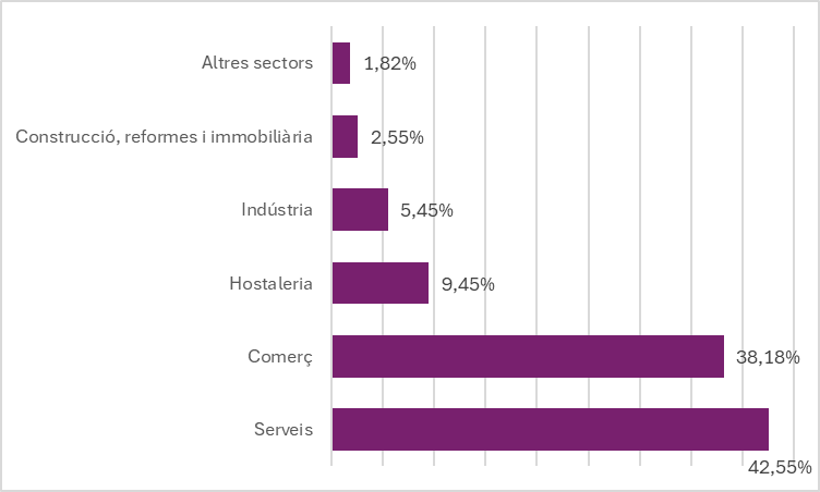 Les dones ateses en el marc del servei estan diferenciades per diferents sectors en funció de la seva àrea d’experiència, i on les dones representen el 42,52% de les persones participants en el servei, on veiem que la majoria d’aquestes es dediquen al sector serveis amb una participació del representen el 42,55%. En relació a la distribució sectorial, en el sector del comerç, representen un 38,18%. En la gràfica que tenim, podem veure diferenciat per sectors la participació que tenen en funció del servei que exerceixen.