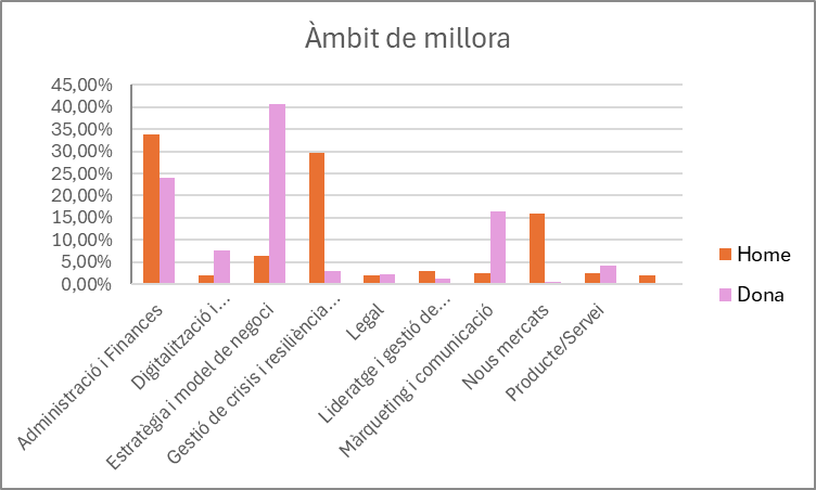 Finalment, l’àrea de millora més sol·licitada per les dones del servei és l’estratègia, seguida de l’administració i finances, demostrant una clara voluntat de re impulsar els seus negocis i potenciar la seva trajectòria empresarial en aquest món de constants canvis. A diferencia dels homes, que també precisen molta ajuda en estratègia, però li donen més prioritat a l’assessorament en finances.